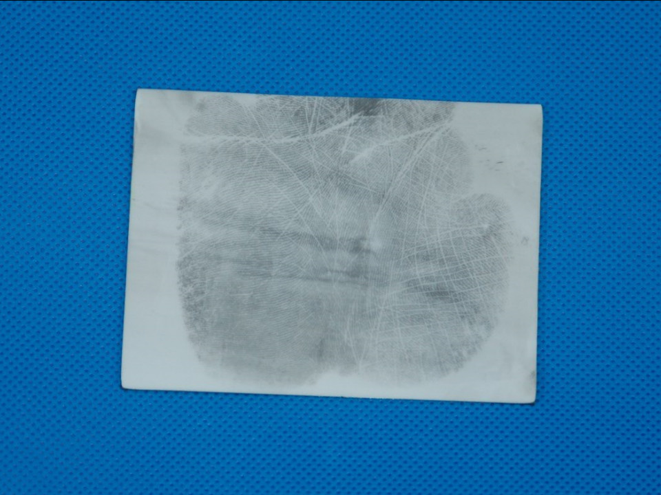 7. 因为明胶提取片具有3、4、5、6项特点,可以用其直接粘取汗液指纹、油脂指纹、油汗混合指纹,再用暗视场或定向反射配光方法提高指纹反差,进行拍照。拍照指纹后,可以用生物物证棉签擦拭明胶片上的指纹,进一步提取指纹中的DNA,使指纹提取与DNA提取互不干扰。