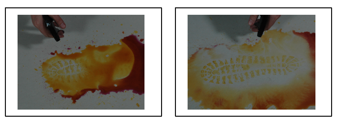 将雾化喷头安装在清洗剂瓶口上,扣动喷头的扳机,用清洗剂的气流冲洗脚印上的染色剂,将染色剂驱赶到血脚印的周边,被染成黄色潜血脚印就现露出来