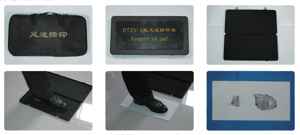 用于提取案件相关人员的鞋印样本。在铁盒内有两块40cmx20cm的储墨垫,储墨垫中储存着适量的油墨,铁盒两面是缓冲橡胶垫。