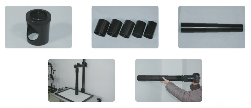 1个定向反射镜、4个转换接圈、5节铝制遮光筒可在30-60cm范围内伸缩。